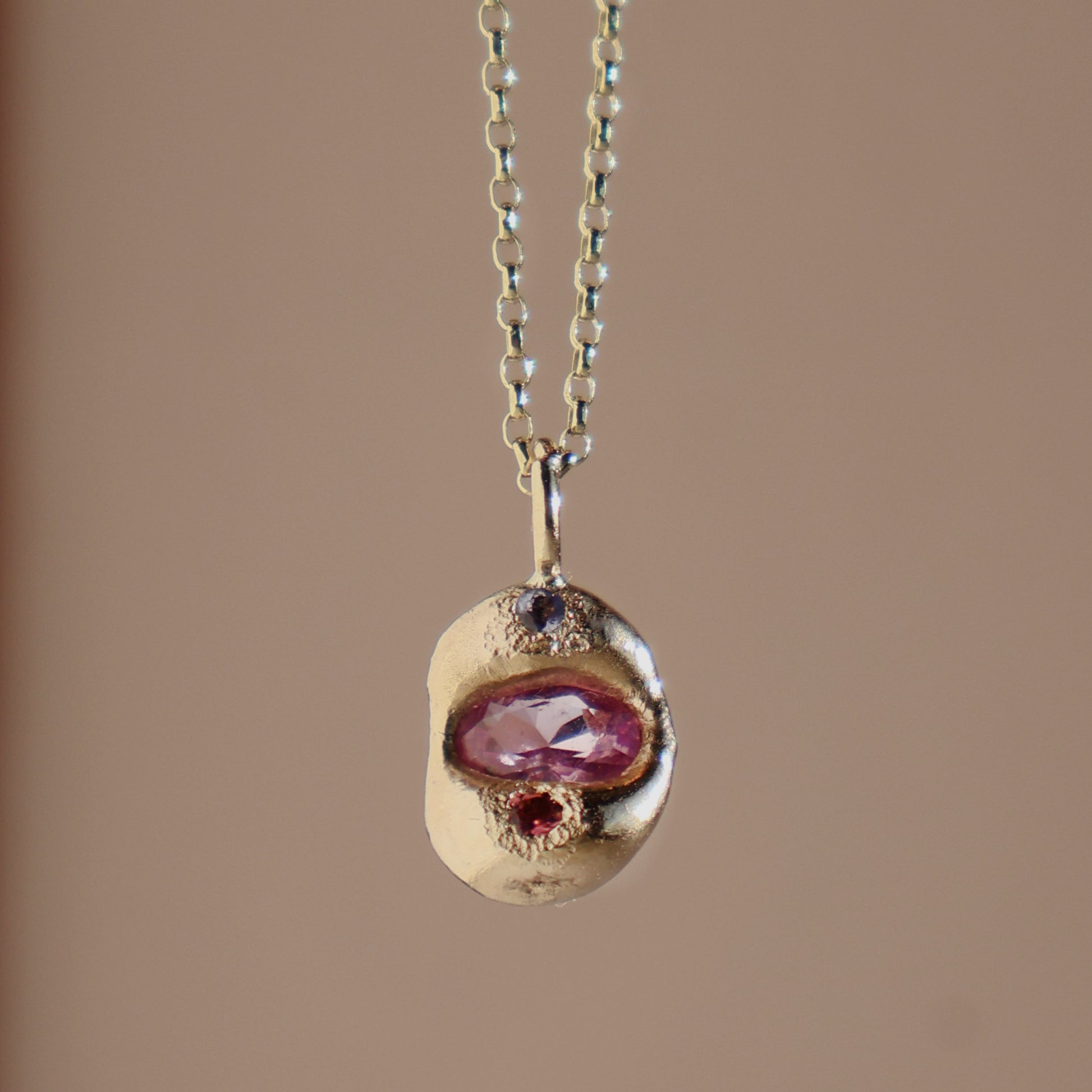 This one of a kind pendant features a stunning lab grown pink sapphire with smaller tanzanite and pink tourmaline sitting inside a nugget of organically formed 9ct gold