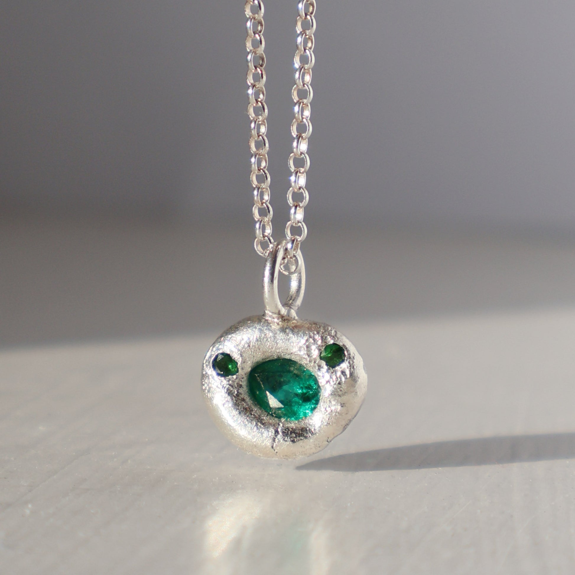 This one of a kind pendant features a stunning lab grown emerald with smaller natural tsavorite garnets sitting inside a nugget of organically formed silver